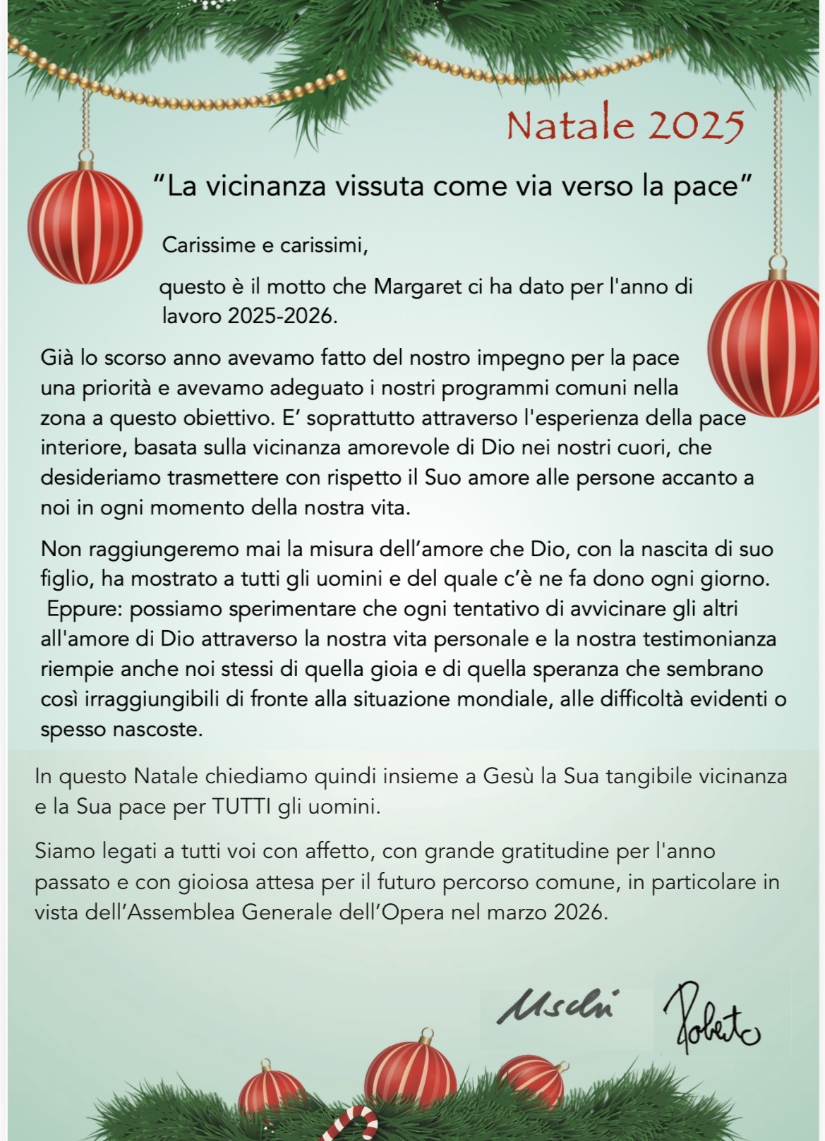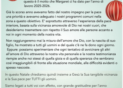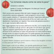 In un tempo ancora così segnato da divisioni di ogni genere, un augurio affinché in occasione di questo Santo Natale si rinnovi in tutti noi la gioia del servizio, la condivisione e la reciprocità, fatta di gesti concreti in particolare per chi soffre; un impegno a vivere un Natale all’insegna della fraternità e della prossimità seminando speranza per il futuro.