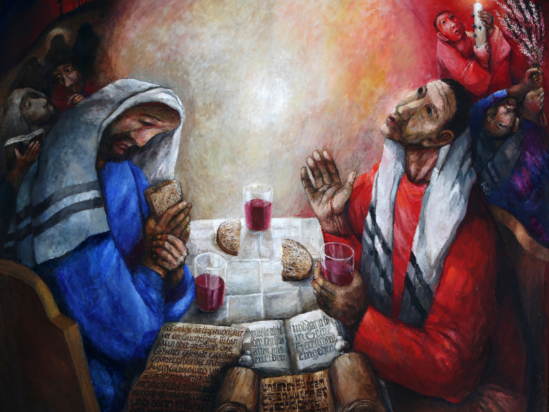 Zwei Jünger verlassen Jerusalem, entmutigt durch den Tod Jesu am Vortag. Sie hatten so große Hoffnungen gehegt, und nun scheint alles verloren. Auf dem Weg zum Dorf Emmaus schließt sich ihnen ein Fremder an. Er hört sich ihre Sorgen an und erklärt ihnen dann die Heilige Schrift: Es wird ihnen warm ums Herz, ohne dass sie wissen, wer er ist. Als sie im Dorf ankommen, tut der Fremde so, als wolle er weitergehen. Sie aber laden ihn nachdrücklich ein: „Bleibe bei uns; denn es wird Abend.“ Der Fremde willigt ein. Während des Abendessens nimmt er Brot, lobt Gott und gibt es den Jüngern – und ist dann plötzlich nicht mehr zu sehen. Da gehen ihnen die Augen auf und sie erkennen, dass es Jesus ist. Sofort kehren sie nach Jerusalem zurück, um den anderen Jüngern die große Nachricht zu verkünden, dass Jesus, der Herr, auferstanden ist.